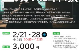 最近なにかと話題の生成AIを使ってみませんか? はじめての生成AI体験では、初めての方でも安心して参加できるよう、アカウントの作成から、効果的な使い方までサポートします。 お仕事はもちろん、趣味や副業にも使えるAIに触れ … 続きを読む はじめての生成AI体験 参加者募集